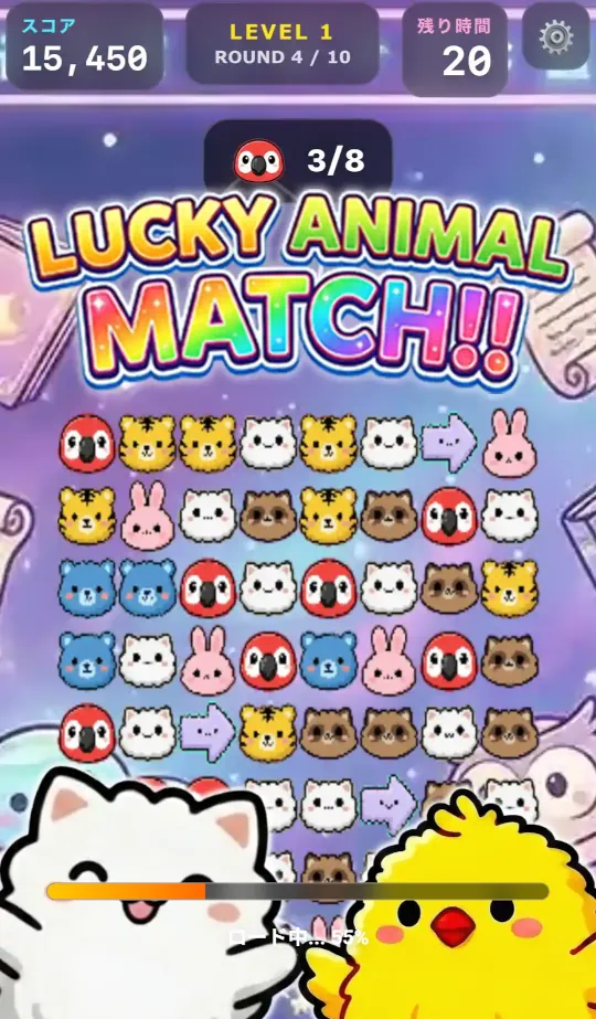 "Lucky Animal Match" is a match-3 puzzle where you swipe to swap blocks and match 3 or more of the same color. Equipped with a level system, the more you play, the higher the score you can aim for! Clear missions to extend time and aim for a high score!
